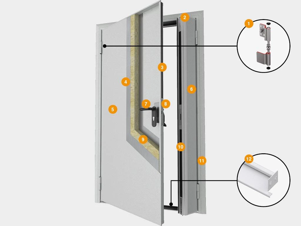 В качестве дополнительной комплектации в полотно могут быть добавлены окна, вентиляционные решетки, выпадающий порог и доводчик. Для дополнительной защиты наличника в нижней части двери может устанавливаться специальная накладка из нержавеющей стали. Тип замочного механизма также может отличаться, в зависимости от индивидуальных предпочтений клиента. Покупатели могут купить двери с открытием вправо или влево.